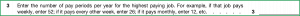 3. Using the highest paying job, enter the number of yearly pay periods. For jobs that pay weekly, enter 52; for jobs that pay every other week, enter 26; and for jobs that pay monthly, enter 12. Put the number on line 3.